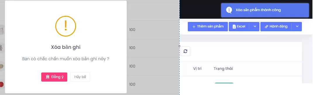 - Hệ thống hiển thị thông báo đồng ý xóa bản ghi sản phẩm chọn xóa và thông báo đã xóa thành công
