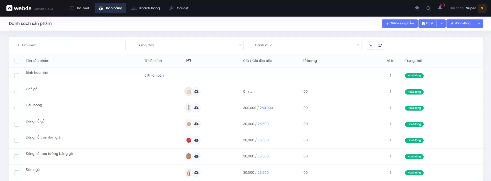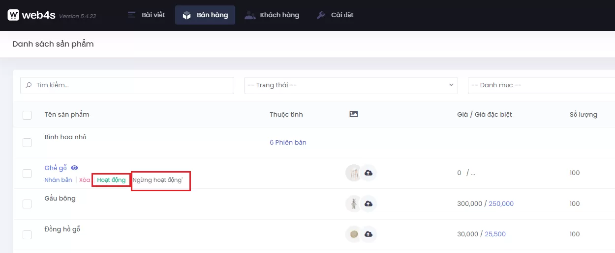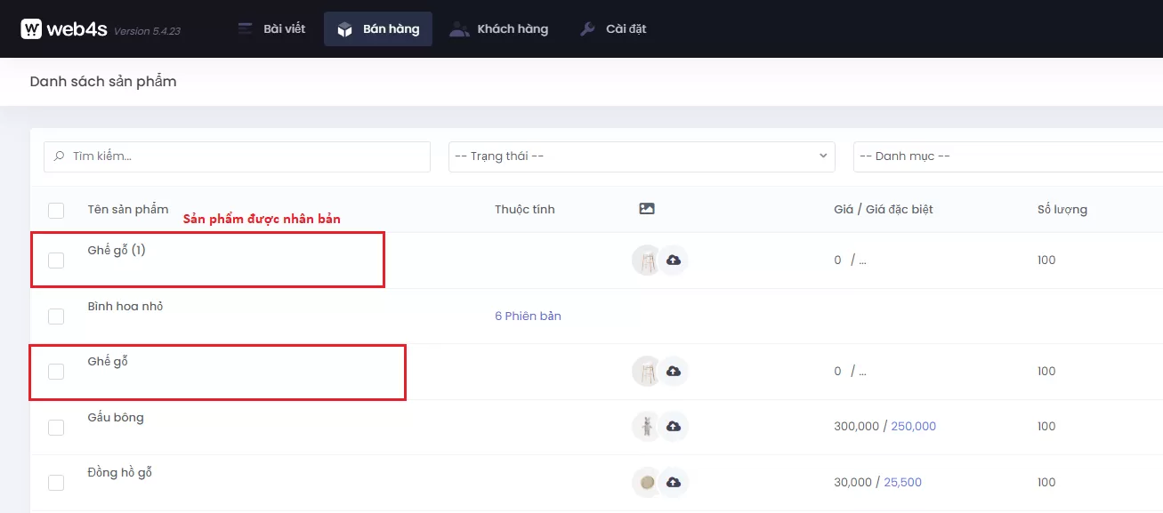 Hướng dẫn nhân bản, xóa, trạng thái sản phẩm trong danh sách sản phẩm trong quản trị giao diện