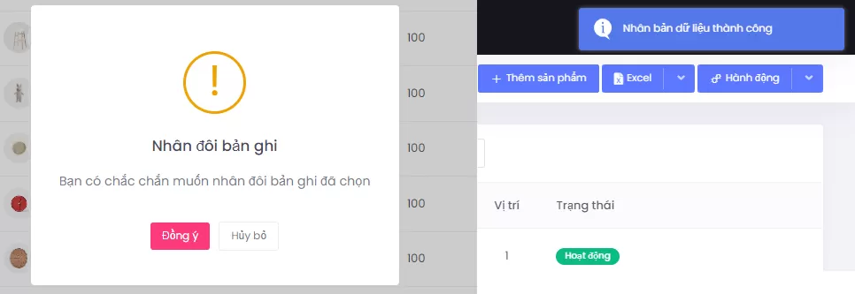 - Hệ thống hiển thị thông báo đồng ý nhân đôi bản ghi sản phẩm chọn nhân bản và thông báo đã nhân bản thành công