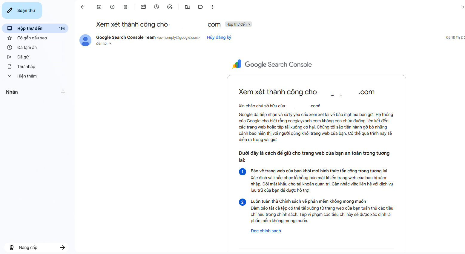 Dưới đây là một email thông báo Google đã xem xét yêu cầu và gỡ bỏ thành công. Và như vậy bạn sẽ có thể truy cập lại website như bình thường.