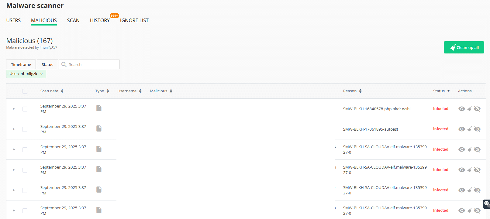 Tại hosting đang cung cấp tại Nhân Hòa có hỗ trợ ứng dựng ImunifyAV giúp scan virus, malware,…. các bạn tiến hành login và hosting và sử dụng công cụ thể scan toàn bộ source code để tìm kiếm các file, thư mục,… nghi ngờ nhiễm mã độc